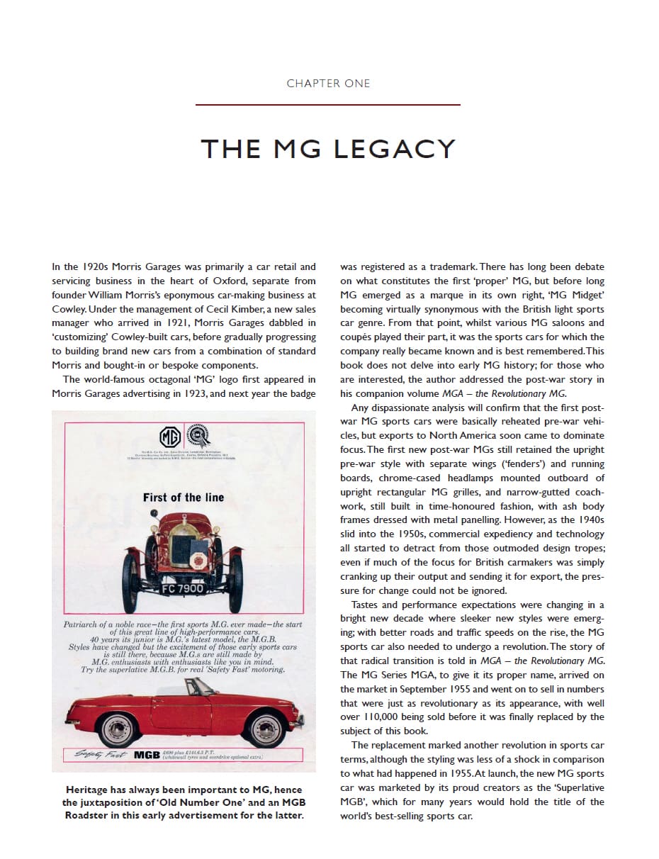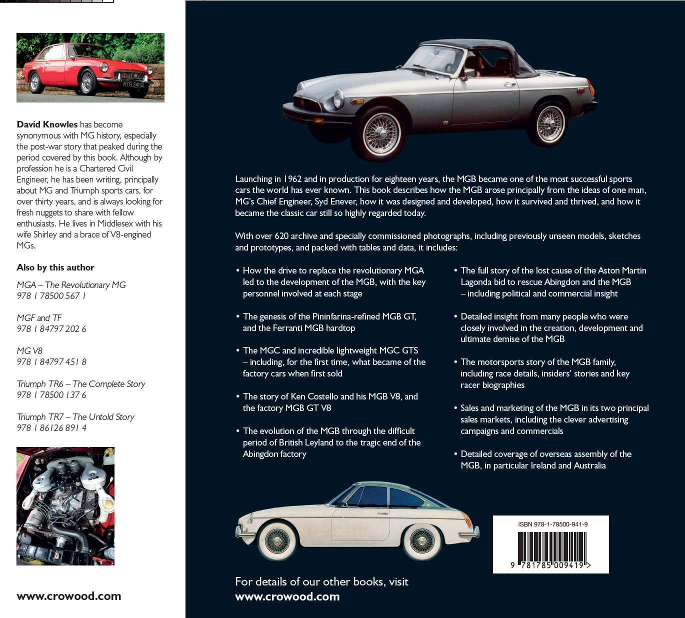 The MGB was a great British success story, a product largely conceived, designed and produced by a small team of dedicated people who genuinely cared about their work. Of course, the MGB came from a proud, successful sports car tradition, and the model it replaced – the revolutionary aerodynamic MGA – had been an unprecedented success – so the new car had big shoes to fill. Launching in 1962 and in production for eighteen years, the MGB became one of the most successful sports cars the world has ever known. This book describes how the MGB arose principally from the ideas of one man, MG’s Chief Engineer, Syd Enever, how it was designed and developed, how it survived and thrived, and how it became the classic car still highly regarded today. There have been many previous books about the MGB, and the related MGC and V8 variants, but MGB – The superlative MG reaches a new level of detail together seasoned with fresh insight. David Knowles has been researching and writing about the MGB for more than thirty years. Prepare to be surprised at some of the stories you will have never read before, and new twists on some you possibly thought you knew well.