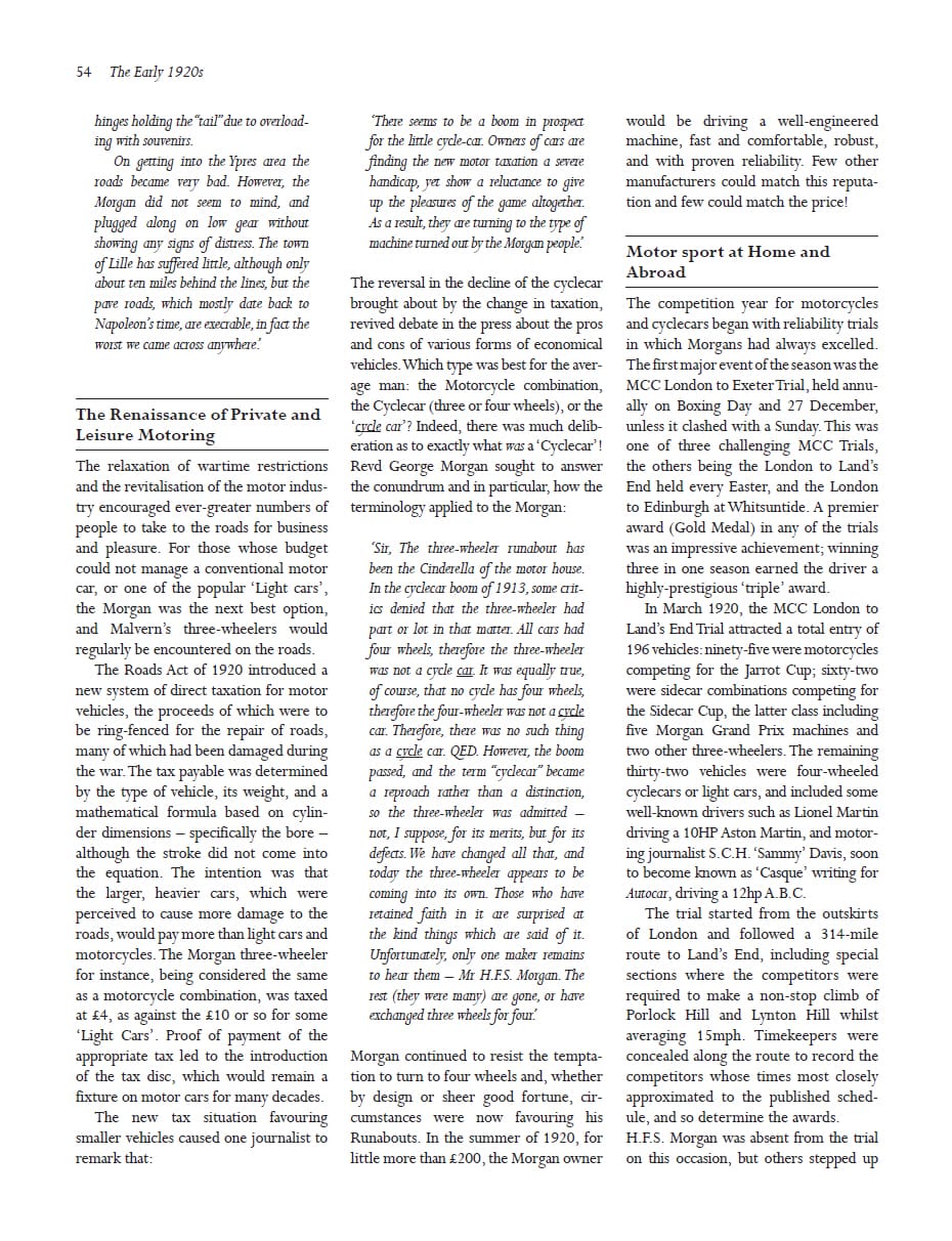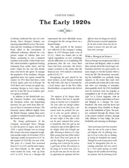 This volume; Morgan, an English Enigma, takes the story further; through the Vintage and Classic periods, to the late 1960s. Martyn bought his first Morgan, a 1953 Plus 4, in 1985, thus fulfilling a desire to own a classic machine built in his home town. A vintage Morgan Aero dating from 1923 soon followed, the three-wheeler providing a fascinating comparison with the later four-wheeled car.