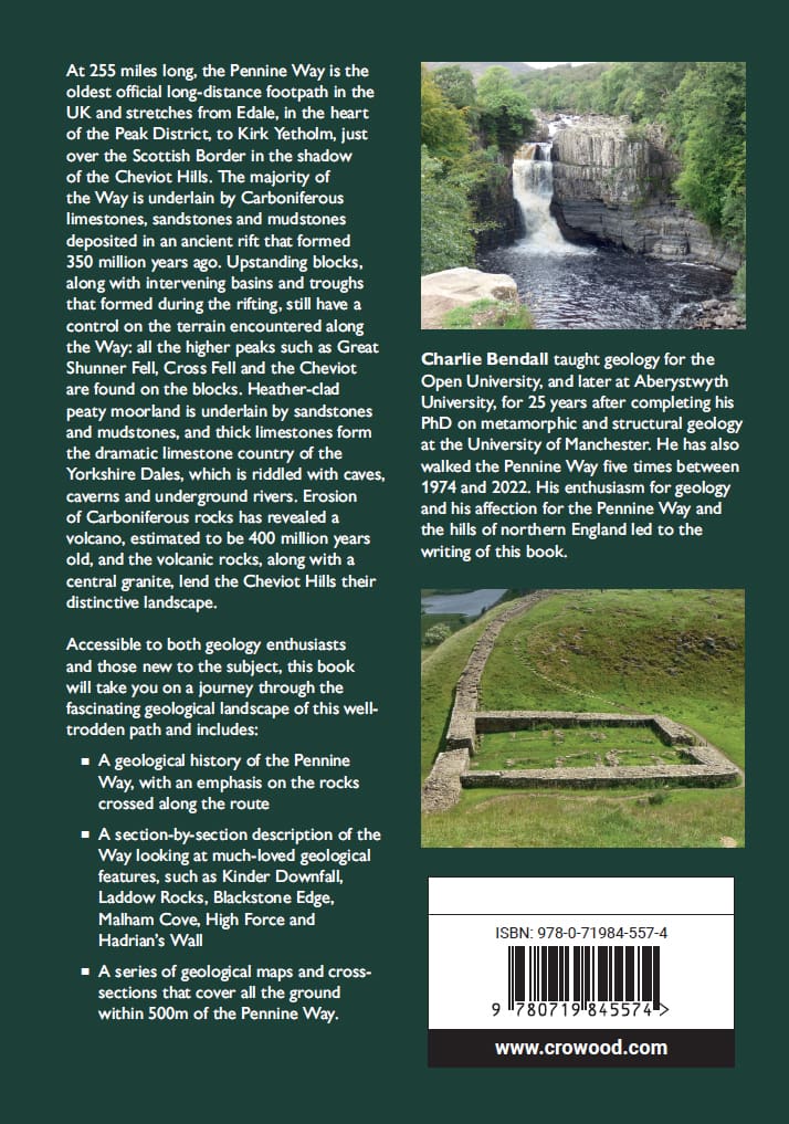 Charlie Bendall taught geology for the Open University, and later at Aberystwyth University, for 25 years after completing his PhD on metamorphic and structural geology at the University of Manchester. He has also walked the Pennine Way five times between 1974 and 2022. His enthusiasm for geology and his affection for the Pennine Way and the hills of northern England led to the writing of this book.