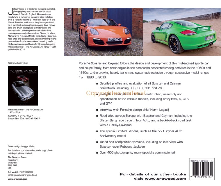 Johnny Tipler is a freelance motoring journalist, photographer, historian and author based in North Norfolk, England. He contributes regularly to a number of motoring titles including 911 & Porsche World, GT Porsche, Total 911 and Classic Porsche. Johnny has had some forty books published on a variety of motoring topics and has written several books for Crowood including Porsche Carrera: The Air-Cooled Era, 1953-1998, published in 2014.