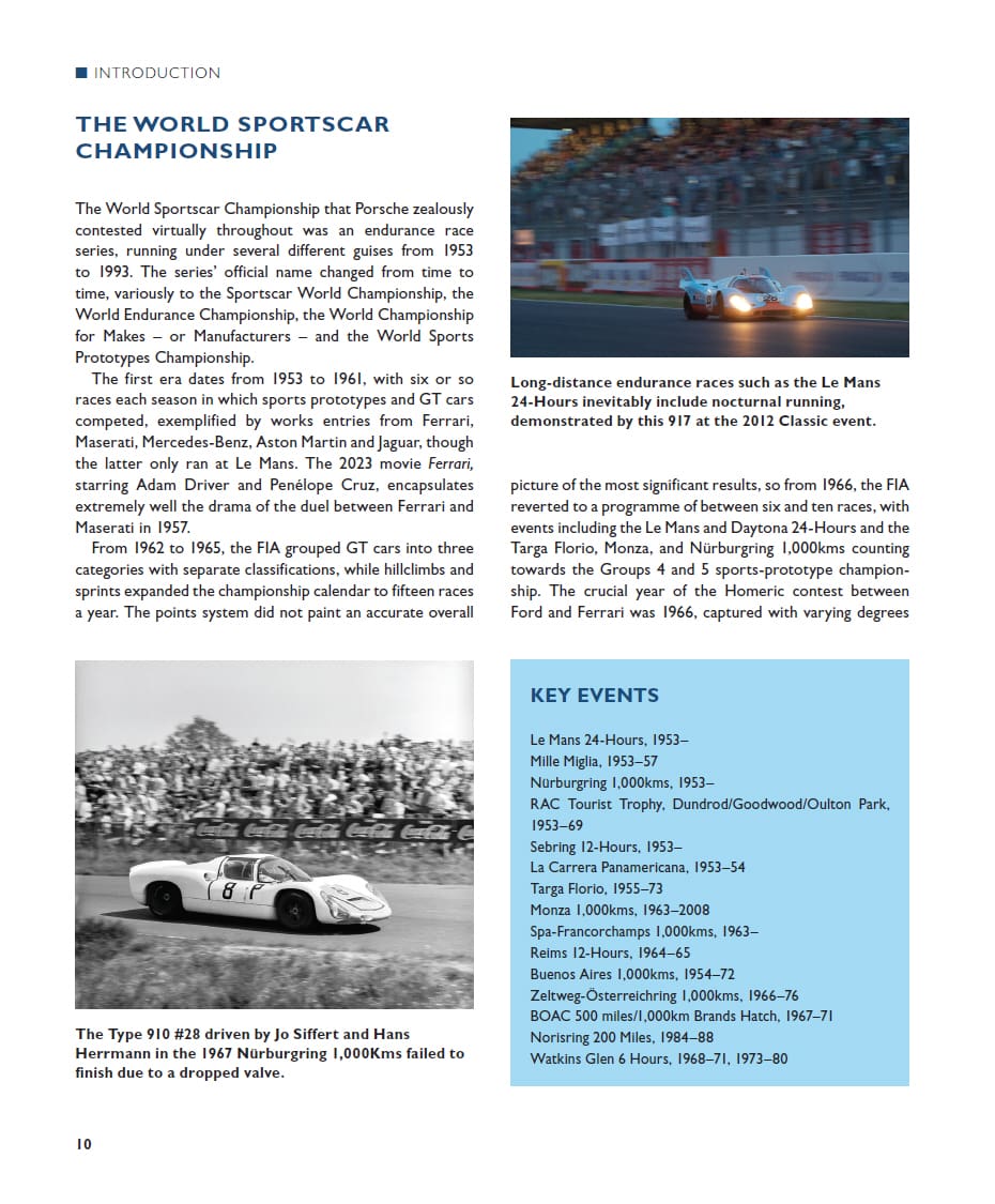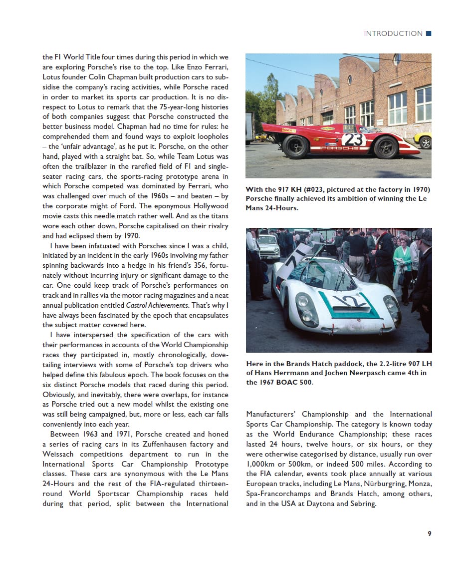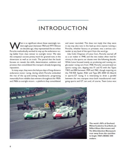 Between the 1950s and 1971, the halcyon days of long-distance endurance motor racing, Porsche embodied the up-and-coming manufacturer, progressing inexorably from reliable class-winner to outright victor – a platform they consolidated and never rescinded. This book focuses on the six distinct Porsche models that raced from 1963 to 1971. Porsche created a series of racing cars – the 904, 906, 910, 907, 908 and 917 – to run in the FIA-regulated International Sports Car Championship Group 6 Prototype class, the Group 4 World Sportscar Championship, and European Hillclimb Championship events held during that period. These races lasted either 24 hours, 12 hours or 6 hours, or were categorised by distance: 1,000km, 500km or 500 miles. Events took place annually at European tracks including Le Mans, Nürburgring, Monza, Spa-Francorchamps and Brands Hatch, and in the USA at Daytona and Sebring. Chronicling each season, this visually stunning volume records Porsche’s multitude of successes.