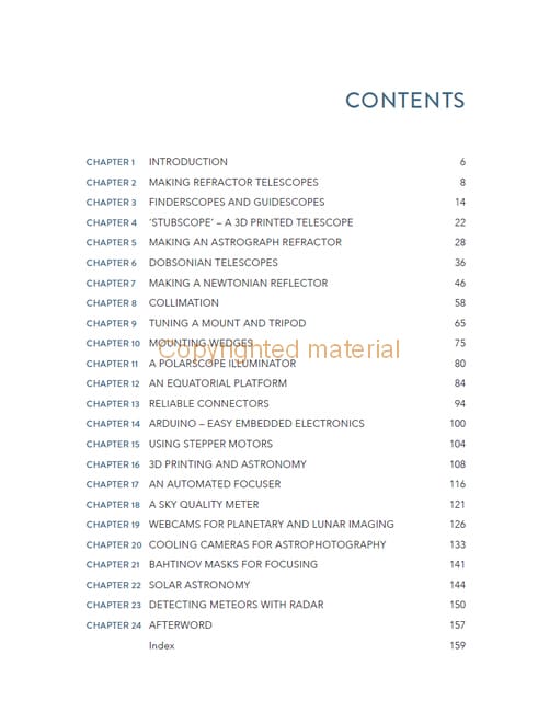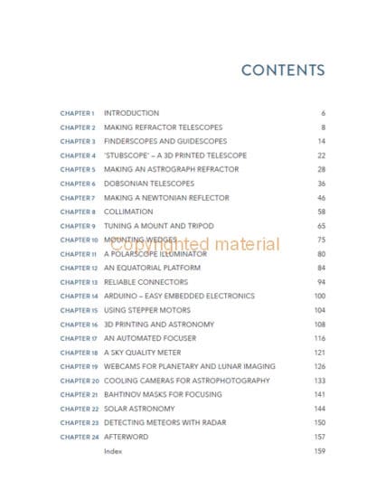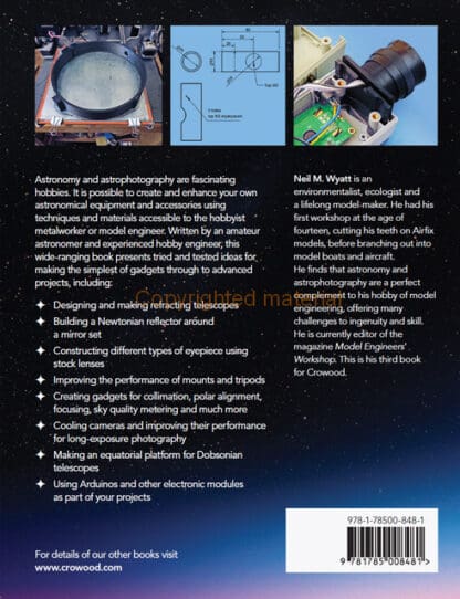 Astronomy and astrophotography are fascinating hobbies. It is possible to create and enhance astronomical equipment and accessories using techniques and materials accessible to the hobbyist metalworker or model engineer. Written by an amateur astronomer and experienced hobby engineer, this wide-ranging book presents tried and tested ideas from the simplest of gadgets to advanced projects. Includes how to design and make refracting telescopes and how to make a Newtonian reflector around a mirror set. Instructions are given on making different types of eyepiece using stock lenses and making gadgets for collimation, polar alignment, focusing, sky quality metering and much more. Information is given on improving the performance of mounts and tripods and how to cool cameras and improve their performance for long-exposure photography. Details are given on making an equatorial platform for Dobsonian telescopes and using Arduinos and other electronic modules as part of your projects.