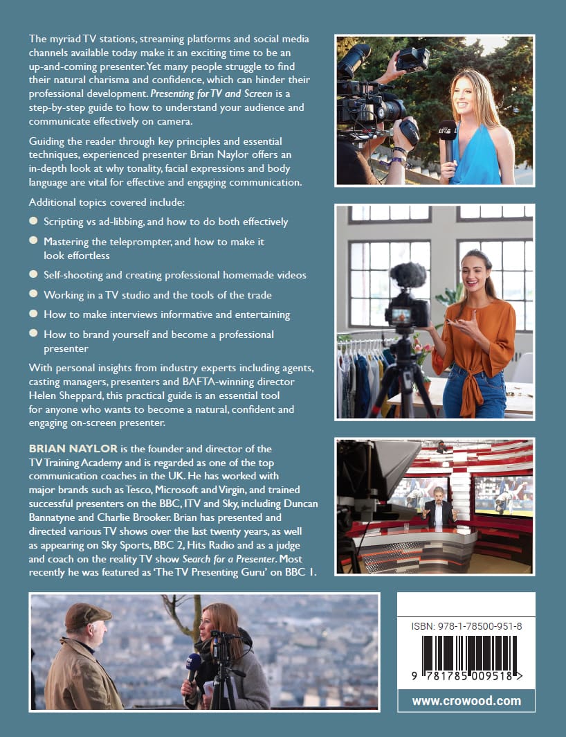 The myriad TV stations, streaming platforms and social media channels available today make it an exciting time to be an up-and-coming presenter. Yet many people struggle to find their natural charisma and confidence, which can hinder their professional development. Presenting for TV and Screen is a step-by-step guide to how to understand your audience and communicate effectively on camera. Guiding the reader through key principles and essential techniques, experienced presenter Brian Naylor offers an in-depth look at why tonality, facial expressions and body language are vital for effective and engaging communication. Additional topics covered include: scripting vs ad-libbing, and how to do both effectively; mastering the teleprompter, and how to make it look effortless; self-shooting and creating professional homemade videos; working in a TV studio and the tools of the trade; how to make interviews informative and entertaining and, finally how to brand yourself and become a professional presenter. With personal insights from industry experts including agents, casting managers, presenters and BAFTA winning director Helen Sheppard, this practical guide is an essential tool for anyone who wants to become a natural, confident and engaging on-screen presenter.