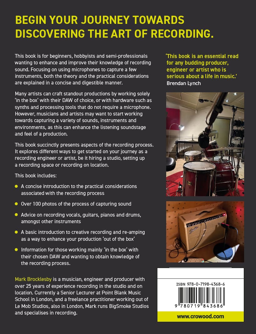 Many artists can craft standout productions by working solely ‘in the box’ with their DAW of choice, or with hardware such as synths and processing tools that do not require a microphone. However, musicians and artists may want to start working towards capturing a variety of sounds, instruments and environments, as this can enhance the listening soundstage and feel of a production. This book succinctly presents aspects of the recording process. It explores different ways to get started on your journey as a recording engineer or artist, be it hiring a studio, setting up a recording space or recording on location. ‘This book is an essential read for any budding producer, engineer or artist who is serious about a life in music.’ – Brendan Lynch