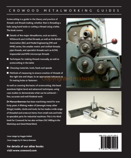 Screwcutting is a guide to the theory and practice of threads and thread-making, whether that is threading a hole using hand tools or cutting a thread using a lathe. The book covers details of the major threadforms, such as metric, Whitworth and Unified threads, as well as the British Association (BA) and Model Engineering (ME and MME) series, the smaller metric and Unified threads, pipe threads, and specialist threads such as ACME, trapezoidal and RMS microscope threads. Techniques for making threads manually, as well as screwcutting in the lathe are also covered. As well as covering the basics of screwcutting, this book examines higher-level and advanced techniques, using case studies to demonstrate what can be achieved – fine, accurate and well-finished work.