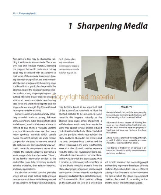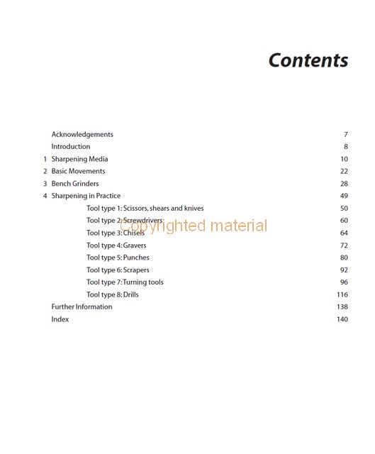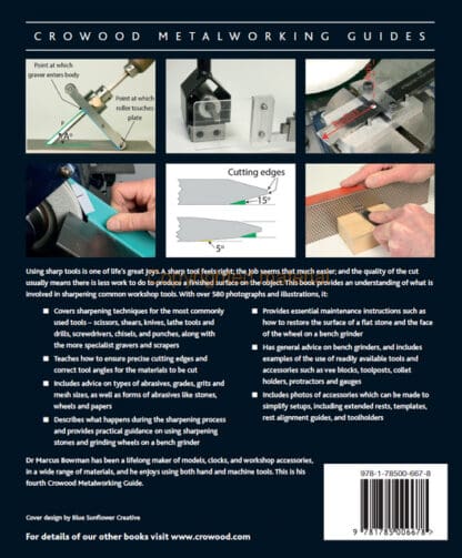 Using sharp tools is one of life’s great joys. A sharp tool feels right; the job seems that much easier; and the quality of the cut usually means there is less work to do to produce a finished surface on the object. This book provides an understanding of what is involved in sharpening common workshop tools. With over 580 colour photographs and illustrations it covers sharpening techniques for the most commonly used tools – scissors, shears, knives, lathe tools and drills, screwdrivers, chisels and punches, along with the more specialist gravers and scrapers. Advice on types of abrasives, grades, grits and mesh sizes is given. It describes what happens during the sharpening process and provides practical guidance on using sharpening stones and grinding wheels on a bench grinder. Provides essential maintenance instructions such as how to restore the surface of a flat stone and the face of the wheel on a bench grinder. Finally, it gives advice on bench grinders, and includes examples of the use of readily available tools and accessories such as vee blocks, toolposts, collet holders, protractors and gauges.