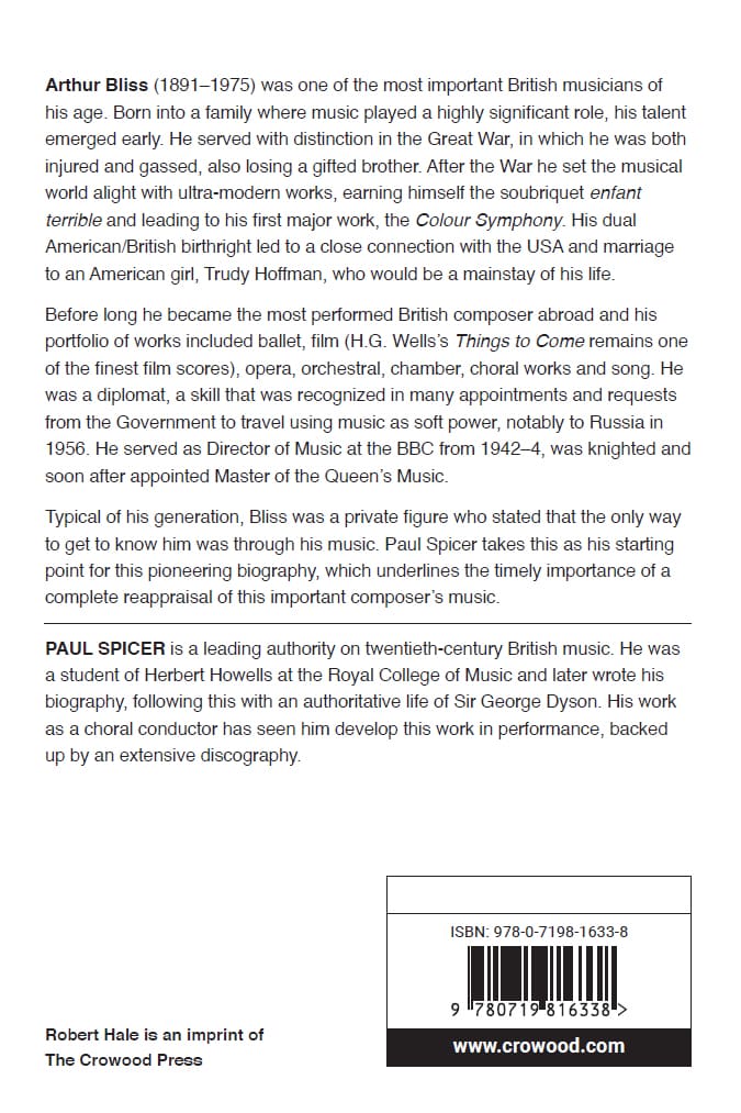 Arthur Bliss (1891–1975) was one of the most important British musicians of his age. Born into a family where music played a highly significant role, his talent emerged early. He served with distinction in the Great War, in which he was both injured and gassed. After the War he set the musical world alight with ultra-modern works, earning himself the soubriquet enfant terrible and leading to his first major work, the Colour Symphony. His dual American/British birthright led to a close connection with the USA and marriage to an American girl, Trudy Hoffman, who would be a mainstay of his life. Before long he became the most performed British composer abroad and his portfolio of works included ballet, film (H.G. Wells’s Things to Come remains one of the finest film scores), opera, orchestral, chamber, choral works and song. He was a diplomat, a skill that was recognized in many appointments from the Government to travel using music as soft power, notably to Russia in 1956. He served as Director of Music at the BBC from 1942–4, was knighted and soon after appointed Master of the Queen’s Music. Bliss was a private figure who stated that the only way to get to know him was through his music. Paul Spicer takes this as his starting point for this pioneering biography, which underlines the timely importance of a complete reappraisal of this important composer’s music.