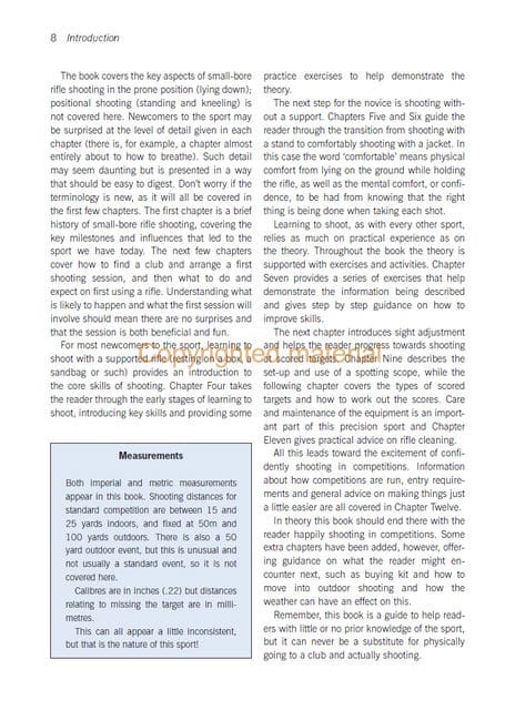 Smallbore Rifle Shooting is essential reading for those who are considering taking up the sport, and for those who already have some experience but wish to improve their skills and participate in competitions. It takes the reader forward from the point at which the very first shot is fired, introduces new levels of understanding and competence, provides useful advice, and answers many of the questions frequently asked by beginners.