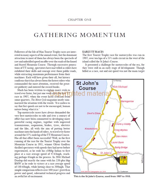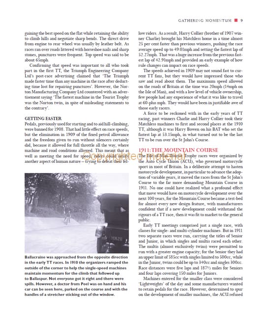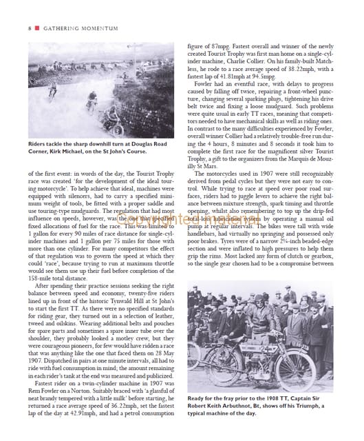 For over 100 years the world’s best motorcycle racers have pitted themselves against the gruelling 373/4 -mile Isle of Man Mountain Course at the annual event known worldwide simply as ‘the TT’. The Tourist Trophy meeting – to give its proper name – represents perhaps the greatest challenge that the sport of motorcycle racing can offer. The top names in road racing – Collier, Wood, Duke, Hailwood, Agostini, Hislop, Jefferies, McGuinness, Hutchinson and the Dunlop dynasty – have all considered the pursuit of a Tourist Trophy to be the ultimate goal. From riding the earliest single-cylinder, belt-driven machines with outputs of under 10bhp, to coping with today’s sophisticated four-cylinder machines giving well over 200bhp, generations of riders have risked their lives to satisfy the desire to go faster than the next man and to win a TT. In the process they have lifted lap speeds by almost 100mph. Exactly how that huge increase has been achieved is told within these pages, set against the background of the triumphs and the tragedies of the TT history.