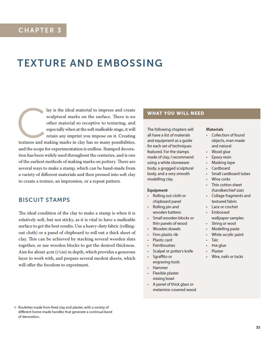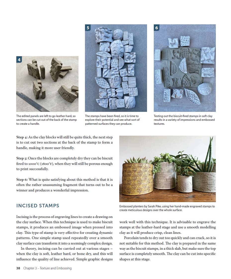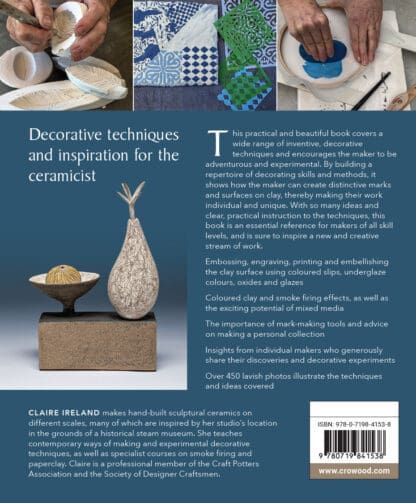 This practical and beautiful book covers a wide range of inventive, decorative techniques and encourages the maker to be adventurous and experimental. By building a repertoire of decorating skills and methods, it shows how the maker can create distinctive marks and surfaces on clay, thereby making their work individual and unique. With so many ideas and clear, practical instruction to the techniques, this book is an essential reference for makers of all skill levels, and is sure to inspire a new and creative stream of work. From embossing, engraving, printing and embellishing the clay surface using coloured slips, underglaze colours, oxides and glazes. Coloured clay and smoke firing effects, as well as the exciting potential of mixed media. The importance of mark-making tools and advice on making a personal collection. With insights from individual makers who generously share their discoveries and decorative experiments