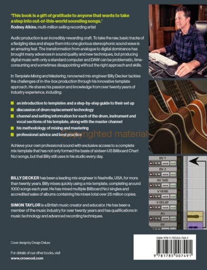 Audio production is an incredibly rewarding craft. To take the raw, basic tracks of a fledgling idea and shape them into one glorious stereophonic sound wave is an amazing feat. The transformation from analogue to digital dominance has brought many advances in sound quality and new techniques, but producing digital music with only a standard computer and DAW can be problematic, time-consuming and sometimes disappointing without the right approach and skills. In Template Mixing and Mastering, renowned mix engineer Billy Decker tackles the challenges of in-the-box production through his innovative template approach. He shares his passion and knowledge from over twenty years of industry experience, including an introduction to templates and a step-by-step guide to their set-up and a discussion of drum replacement technology. Channel and setting information for each of the drum, instrument and vocal sections of his template is discussed along with the master channel and his methodology of mixing and mastering. Finally, he gives professional advice and best practice. Foreword by Rodney Atkins