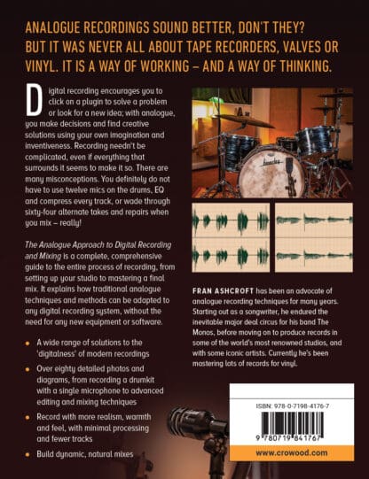 Digital recording encourages you to click on a plugin to solve a problem or look for a new idea; with analogue, you make decisions and find creative solutions using your own imagination and inventiveness. Recording needn’t be complicated, even if everything that surrounds it seems to make it so. There are many misconceptions. You definitely do not have to use twelve mics on the drums, EQ and compress every track, or wade through sixty-four alternate takes and repairs when you mix – really! The Analogue Approach to Digital Recording and Mixing is a complete, comprehensive guide to the entire process of recording, from setting up your studio to mastering a final mix. It explains how traditional analogue techniques and methods can be adapted to any digital recording system, without the need for any new equipment or software.