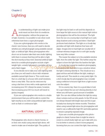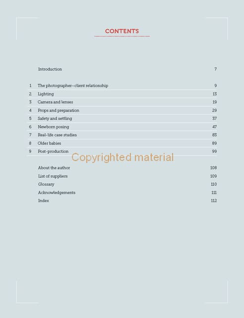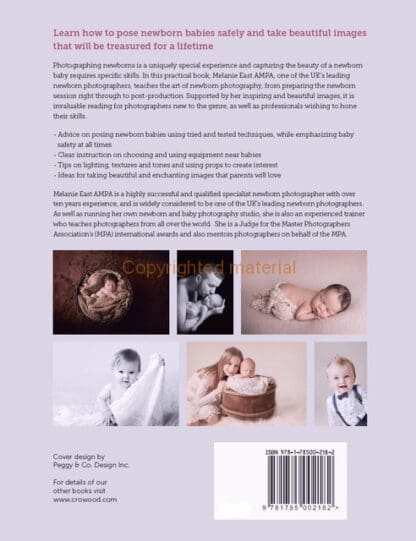 Photographing newborns is a uniquely special experience and capturing the beauty of a newborn baby requires specific skills. In this practical book, Melanie East, one of the UK’s leading newborn photographers, shares her secrets, from preparing for the newborn session through to post-production work. Advice is given on posing newborn babies using tried and tested techniques, while emphasizing the baby’s safety at all times. Also Melanie gives clear instruction on choosing and using equipment near babies. Supported by her inspiring images, it is invaluable reading for photographers new to the genre, as well as professionals wishing to hone their skills.