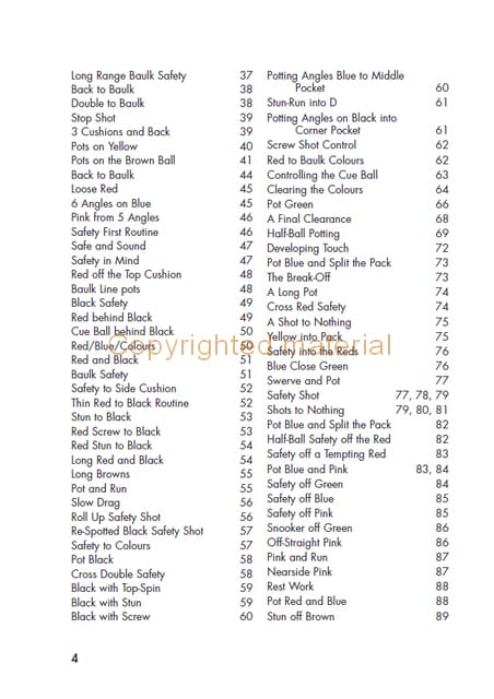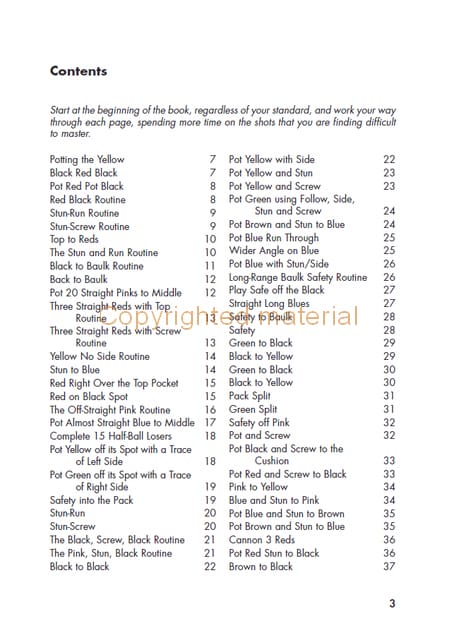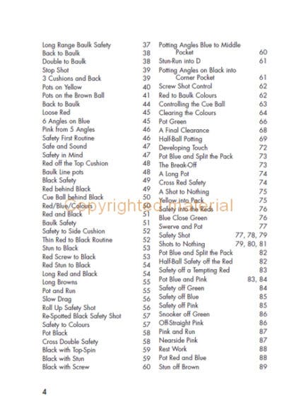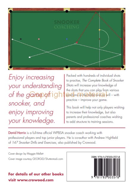 The Complete Book of Snooker Shots will increase your knowledge of the shots that you can play from various positions on the table and so will – with practice – improve your game. This book will help not only players wishing to increase their knowledge, but also parents and professional coaches wishing to add structure to training sessions. Enjoy increasing your understanding of the game of snooker, and enjoy improving your knowledge. Packed with hundreds of individual shots to practice.