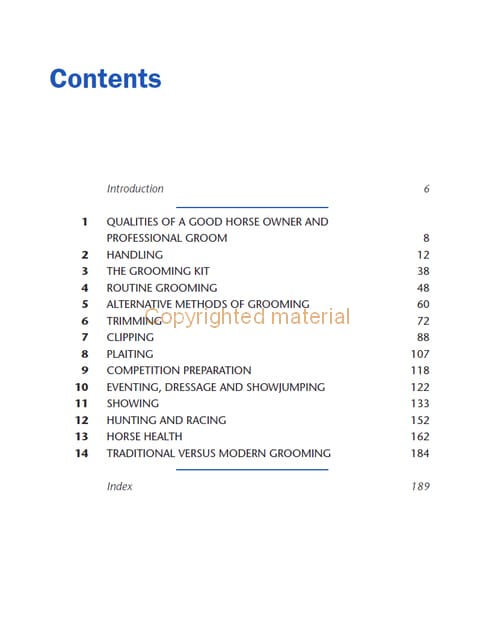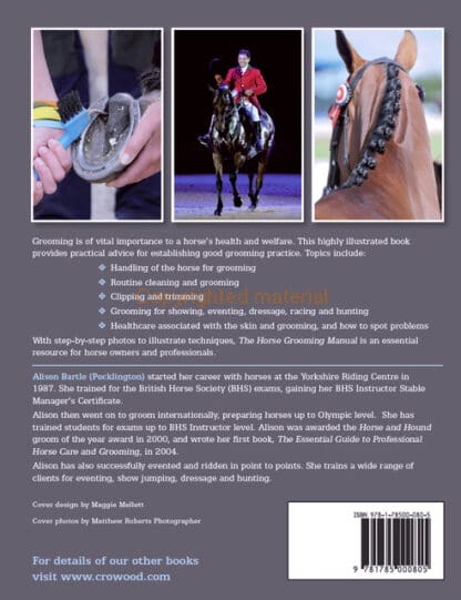 Grooming is of vital importance to a horse’s health and welfare. This highly illustrated book provides practical advice for establishing good grooming practice. Topics covered in the book are: handling of the horse for grooming; routine cleaning and grooming; clipping and trimming; grooming for showing, eventing, dressage, racing and hunting; healthcare associated with the skin and grooming, and how to spot problems. Includes over 300 step-by-step colour photographs to illustrate techniques.