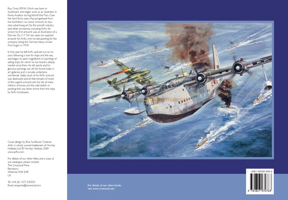 Roy Cross was born in Southwark and began work as an illustrator during World War II. Over the next thirty years he produced line illustration, colour artwork and top-class advertising art for the aircraft industry and other companies, including Airfix, for whom he supplied artwork for ten years. In 1974 Roy set out on his own, following a love for ships and the sea, and began to paint magnificent oil paintings of sailing ships, for which he has found a steady market since then. He still paints and his glorious paintings can be found in art galleries and in private collections worldwide.