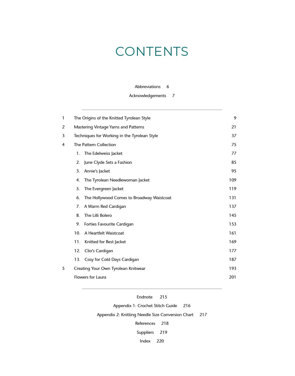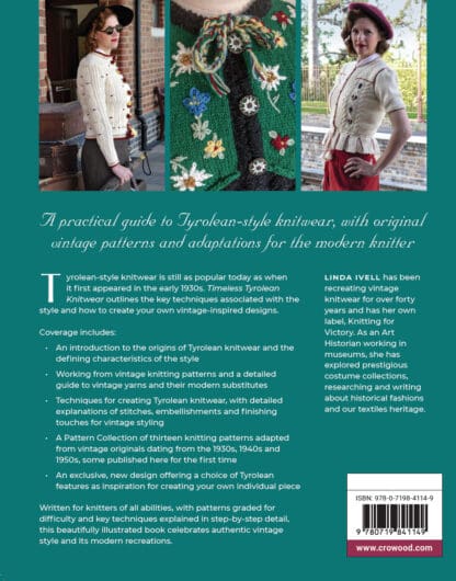 The passion for Tyrolean-style knitwear has endured for nearly one hundred years and it is still as popular today as when it first appeared in the early 1930s. Timeless Tyrolean Knitwear outlines the key techniques associated with the style and offers inspiration and guidance for creating your own vintage-inspired designs. Coverage includes an introduction to the origins and inspiration for Tyrolean knitwear and the defining characteristics of the fashionable style plus advice for working from vintage knitting patterns and adaptations for the modern knitter. There is a guide to vintage yarns and their modern substitutes and a Pattern Collection of thirteen knitting patterns adapted from vintage originals dating from the 1930s, 1940s and 1950s, some published here for the first time. Finally, there is an exclusive, new design offering a choice of vintage Tyrolean features and shapes to use as a ‘menu’ of inspiration for creating your own individual piece.
