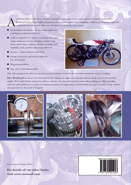 Dave Boothroyd has always been fascinated by the workings of engines, in particular with two-stroke motorcycles and their engines. He bought his first motorcycle at fifteen and since then has rarely passed a week without riding one. After attending university and qualifying as a teacher, he introduced motorcycle engineering to schools before moving on to teach college students and apprentices in the north of England.