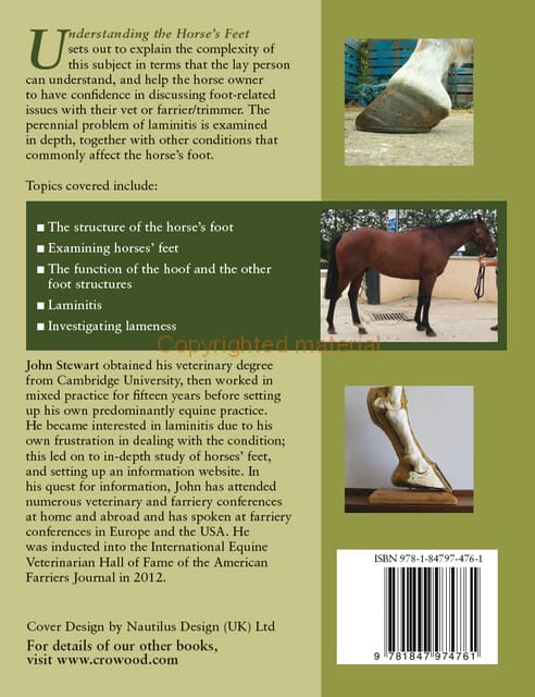 John Stewart obtained his veterinary degree from Cambridge University, then worked in mixed practice for fifteen years before setting up his own predominantly equine practice. He became interested in laminitis due to his own frustration in dealing with the condition; this led on to in-depth study of horses' feet, and setting up an information website. In his quest for information, John has attended numerous veterinary and farriery conferences at home and abroad and has spoken at farriery conferences in Europe and the USA. He was inducted into the International Equine Veterinarian Hall of Fame of the American Farriers Journal in 2012.