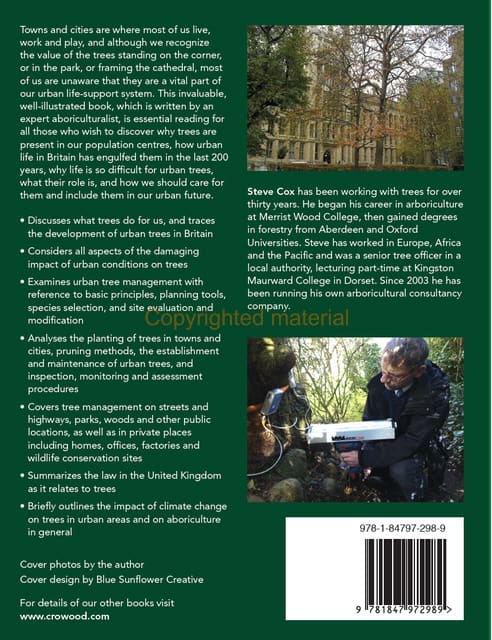 Towns and cities are where most of us live, work and play, and although we recognize the value of the trees standing on the corner, or in the park, or framing the cathedral, most of us are unaware that they are a vital part of our urban life-support system. Discusses what trees do for us, and traces the development of urban trees in Britain. Considers all aspects of the damaging impact of urban conditions on trees. Examines urban tree management with reference to basic principles, planning tools, species selection, and site evaluation and modification. Analyses the planting of trees in towns and cities, pruning methods, the establishment and maintenance of urban trees, and inspection, monitoring and assessment procedures. Covers tree management on streets and highways, parks, woods and other public locations, as well as in private places including homes, offices, factories and wildlife conservation sites. Summarizes the law in the UK as it relates to trees. Briefly outlines the impact of climate change on trees in urban areas and on arboriculture in general. This invaluable book is essential reading for all those who wish to discover why trees are present in our population centres, how urban life in Britain has engulfed them in the last 200 years, why life is so difficult for urban trees, what their role is, and how we should care for them and include them in our urban future.