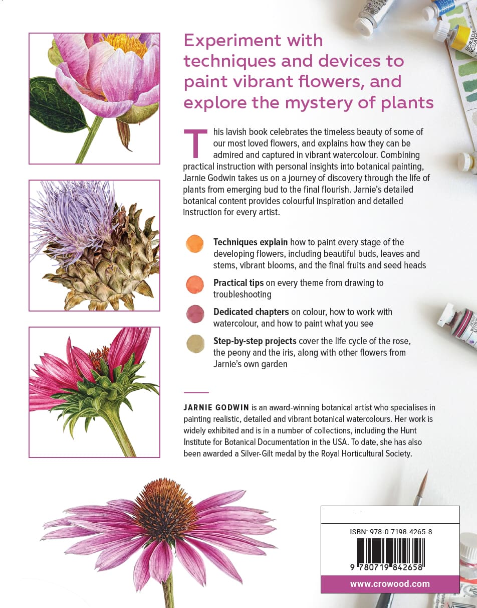This lavish book celebrates the timeless beauty of some of our most loved flowers, and explains how they can be admired and captured in vibrant watercolour. Combining practical instruction with personal insights into botanical painting, Jarnie Godwin takes us on a journey of discovery through the life of plants from emerging bud to the final flourish. Jarnie’s detailed botanical content provides colourful inspiration and detailed instruction for every artist.