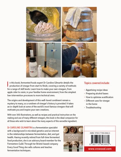 In this book, fermented foods expert Dr Caroline Gilmartin details the production of vinegar from start to finish, covering a variety of methods for a range of skill levels. Learn how to make your own vinegars, from apple cider to raisin, in your familiar home environment, from the simplest low-intervention processes to more technical ones.