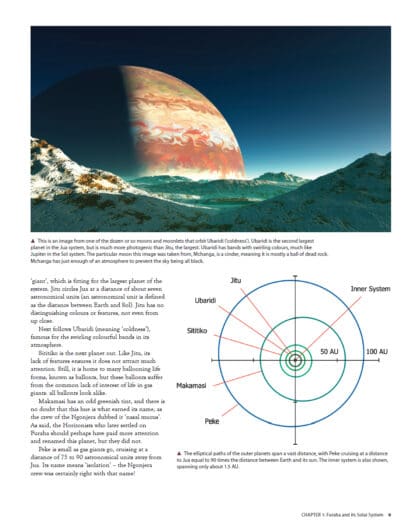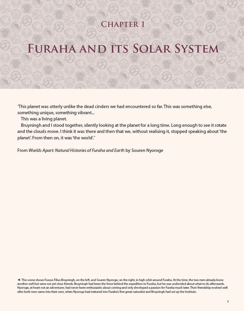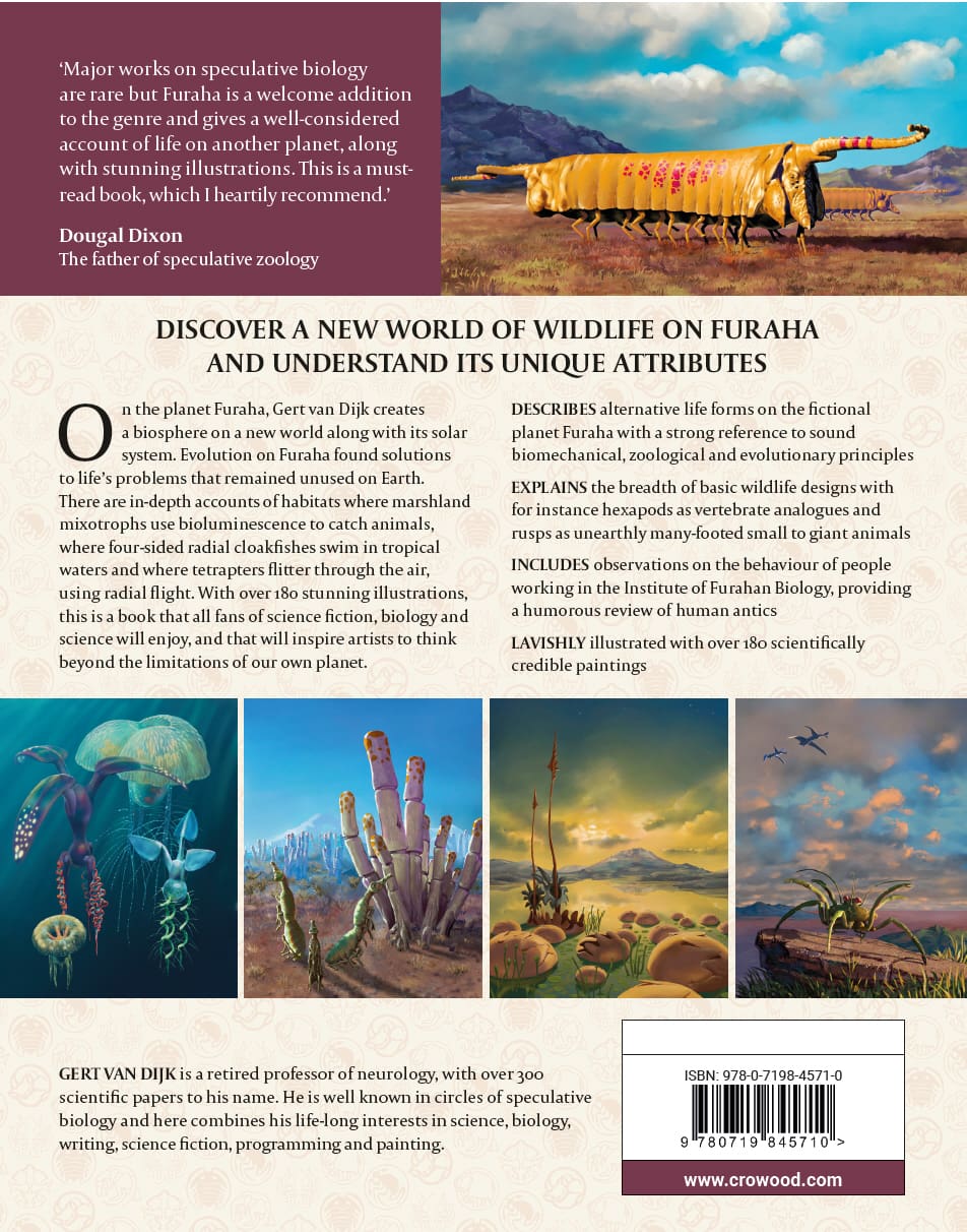On the planet Furaha, Gert van Dijk creates a biosphere on a new world along with its solar system. Evolution on Furaha found solutions to life’s problems that remained unused on Earth. There are in-depth accounts of habitats where marshland mixotrophs use bioluminescence to catch animals, where four-sided radial cloakfishes swim in tropical waters and where tetrapters flitter through the air, using radial flight. With over 180 stunning illustrations, this is a book that all fans of science fiction, biology and science will enjoy, and that will inspire artists to think beyond the limitations of our own planet.